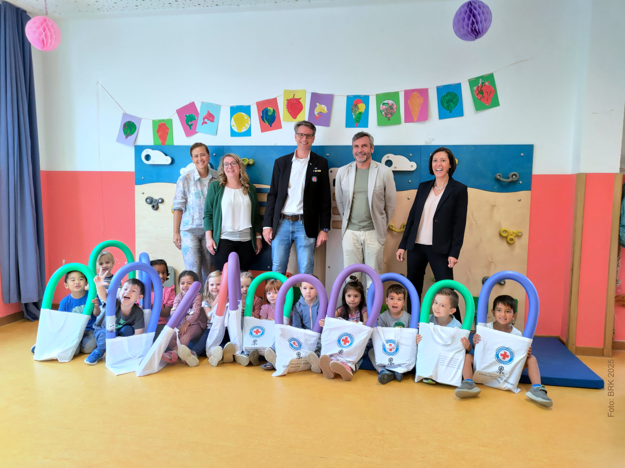 Am Mittwoch, den 23.07.25, besuchte der Vorstand der Edith-Haberland-Wagner Stiftung den Kindergarten „Leuchtturm“ unter der Leitung von Edina Martinovic. Dem Kindergarten wurden die Schwimmlerntaschen von Michael Welzel, Vorsitzendem der Wasserwacht des Münchner Roten Kreuzes, Monika Jahn, stellvertretende Geschäftsführerin des Münchner Roten Kreuzes, Martin Liebhäuser, Vorstand der Edith-Haberland-Wagner Stiftung, und Monika Beranek, Eventmanagerin der Edith-Haberland-Wagner Stiftung, überreicht. Von den 1.000 Taschen wurden nun 218 Schwimmlerntaschen an die Münchner BRK-Kindergärten insgesamt. Die restlichen 782 Schwimmlerntaschen werden durch die Ortsgruppen der Münchner Wasserwacht anteilig der erschwommenen Bahnen an lokale Kindergärten übergeben. Unterhaching verteilt 269, Unterföhring 206, München Mitte 107, Lerchenau 96, München Nord 46, München West 30 und Feldkirchen 28 Schwimmlerntaschen.